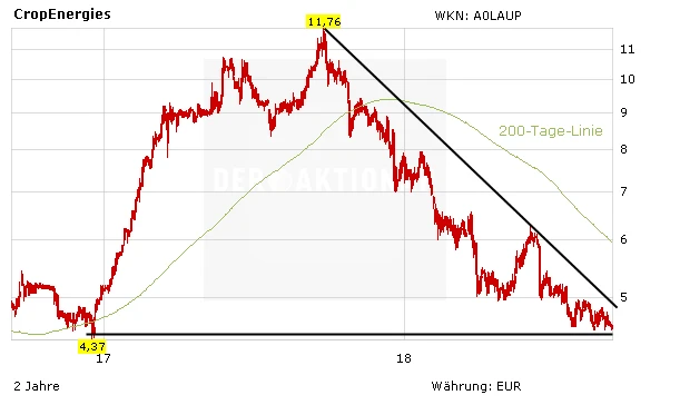 Auch wenn das Chartbild der CropEnergies-Aktie nicht mit Kaufsignalen auftrumpft: Auf dem aktuellen Kursniveau ist viel Pessimismus eingepreist. Kommen die Strafzölle für Billigimporte, sollte sich das Ethanol-Preisniveau wieder aufhellen. Mutige Anleger gehen eine antizyklische Position ein und setzen auf die Trendwende. Mehr zu CropEnergies und dem Bioenergie-Hersteller Verbio lesen Sie hier.