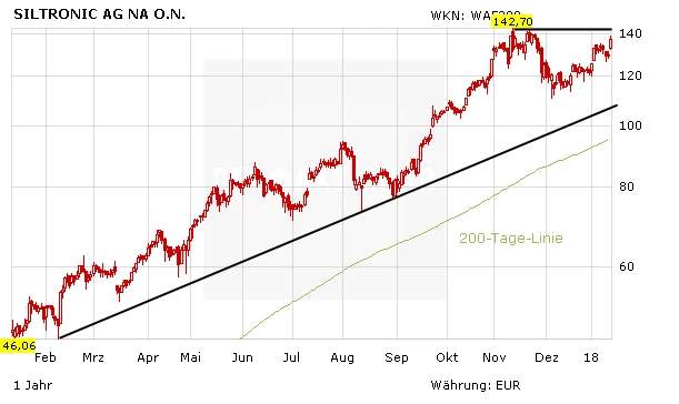 Mit weitem Abstand führt die Aktie von Siltronic die TecDAX-Gewinnerliste im heutigen Handel an. Der Grund ist eine neue Kaufempfehlung, die der Wafer-Produzent von der Deutschen Bank erhalten hat. Damit nähern sich die Siltronic-Papiere dem bisherigen Rekordhoch bei 142,70 Euro an. Fällt diese Chartmarke, löst der TecDAX-Titel ein frisches Kaufsignal aus.