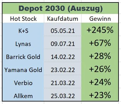 Tatsächlich hat K+S jüngst erneut die Prognose angehoben. 2022 wird nun ein EBITDA von bis zu 2,6 Milliarden Euro erwartet (Vorjahr 969 Mio.) Weiterer Aspekt, weswegen wir aus fundamentalen Gründen selbst nach einer Performance von 240 Prozent an der Restposition von K+S im Depot 2030 festhalten. Yara könnte weniger von Belaruskali, sondern von mehr von westlichen Anbietern kaufen. Wie im Report berichtet, dürfte Yara schon kleine Mengen von K+S bezogen haben, Kontakt besteht also und die Chance auf größere Aufträge.