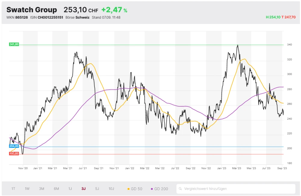 Die durchaus guten Verkaufszahlen der "Moonswatch" spiegeln sich nicht im Aktienkurs der Swatch Group wider. Seit Anfang des Jahres hat die Aktie etwa zehn Prozent nachgegeben und befindet sich weiterhin im Abwärtstrend. Maßgeblich verantwortlich hierfür dürfte der schwächelnde Hauptabsatzmarkt in China sein. Sollte die Aktie bei 240 CHF keinen Boden finden, droht ein weiterer Kursrutsch Richtung 220 CHF. Anleger bleiben eher an der Seitenlinie.