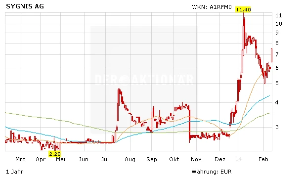 Die Sygnis-Aktie legte in den letzten Wochen deutlich zu. Kurz nach der Empfehlung in DER AKTIONÄR 52/2013 setzte die Aktie zum Höhenflug an. Von rund 2,90 Euro stieg das Papier bis auf über elf Euro. „Wir hatten eine sehr starke Nachfrage von Investorenseite bei unserer Kapitalerhöhung. Zudem haben wir in den letzten Wochen sehr viele Gespräche geführt, was sicherlich dazu geführt hat, dass die Visibilität und die Bekanntheit unserer Aktie gestiegen ist“, sagt Sygnis-Unternehmenssprecher Michael Wolf gegenüber dem AKTIONÄR. Das war aber dann doch ein Schluck zu viel aus der Pulle. Die anschließende knackige Konsolidierung führte das Papier wieder bis auf rund 5,00 Euro zurück.