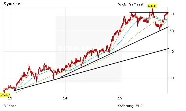 Für das laufende Jahr zeigte sich Konzernchef Heinz-Jürgen Bertram weiterhin sehr zuversichtlich. Symrise sei "mit gutem Tempo" in das vierte Quartal gestartet. Der Konzern wolle erneut schneller wachsen als der Markt für Aromen und Duftstoffe. Die Profitabilität soll dabei gemessen an der operativen Marge (Ebitda-Marge) mit mehr als 20 Prozent hoch bleiben. Nach neun Monaten lag diese Kennzahl bei 22,7 (Vorjahr: 21,6) Prozent. Auch die mittelfristigen Ziele bis 2020 bestätigte er. Der schweizerische Konkurrent Givaudan hatte zuletzt bereits überraschend starke Zahlen vorgelegt.