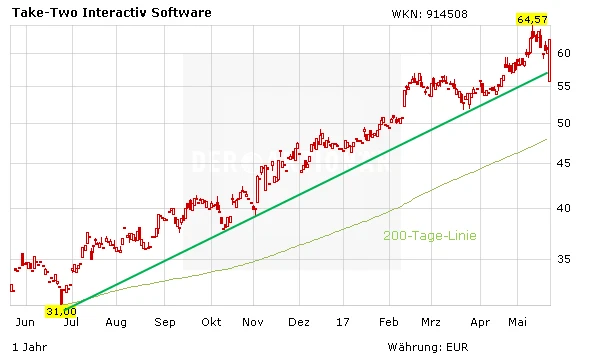 Die Wachstumsstory steht – Kursfantasie ist vorhanden. Mit einem KGV von 24 ist Take-Two zwar etwas höher bewertet als die Branchengrößen Electronic Arts (22) und Activision Blizzard (23), wächst dafür aber schneller als die Konkurrenz. Von 2015 bis 2018 weist der Konzern ein PEG von 0,4 auf – bombastisch. AKTIONÄR setzt das Kursziel auf 77 Euro und empfiehl den Anlegern die Gewinne laufen zu lassen.