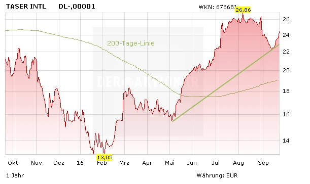 Taser-CEO und Co-Gründer Rick Smith sagt: „Mit Atlanta sind bereits über 50 Prozent der großen Städte in Amerika an Bord“. Die Firma aus Arizona hat seit den ersten Vorfällen – der Todesfall des Teenagers Michaell Brown in Ferguson, Minnesota – über 170.000 Body-Cams namens Axon verkauft. Der Umsatz dieses Geschäftsbereichs belief sich im zweiten Quartal auf 13,2 Millionen Dollar - ein Anstieg von 40 Prozent im Vergleich zum Vorjahr. Zum Vergleich: der Umsatz im Waffensegment konnte nur um 20 Prozent gesteigert werden.