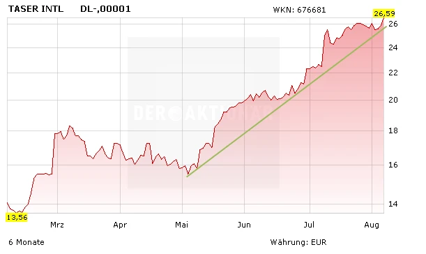 Taser, der Konzern aus Arizona, der für seine gleichnamigen Elektroschocker bekannt geworden ist, hat seine Zahlen fürs zweite Quartal vorgelegt. Der Umsatz kletterte um 26 Prozent auf 58,8 Millionen Dollar - das ist ein neuer Rekord! Der Nettogewinn sank jedoch von 6 Millionen auf 3,65 Millionen Dollar.