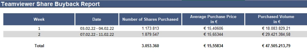 Das Aktienrückkaufprogramm scheint seine Wirkung nicht zu verfehlen. Zur Erinnerung: Das Programm hat ein Volumen von bis zu 300 Millionen Euro oder maximal 20 Millionen Aktien, was knapp zehn Prozent aller derzeit im Umlauf befindlichen Aktien der Gesellschaft entspricht. Es läuft seit dem 3. Februar und soll laut Mitteilung innerhalb des Geschäftsjahrs 2022 abgeschlossen werden.