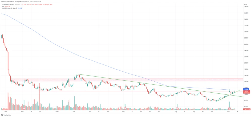 Anfang Oktober wechselte die Teamviewer-Aktie, die bis auf 7,25 Euro abverkauft worden war, in den Rallymodus. Die überzeugenden Geschäftszahlen (DER AKTIONÄR berichtete) katapultierten den Titel nicht nur über die Abwärtstrendlinie bei etwa 9,70 Euro, sondern im Intraday-Handel auch über die 11-Euro-Marke und den GD200 bei 11,36 Euro.