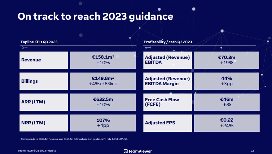 Der Umsatz legte im dritten Quartal um zehn Prozent auf 158,1 Millionen Euro zu. Bei den Rechnungsstellungen (Billings) ging das Wachstum gegenüber dem Vorquartal dagegen zurück, vor allem im wichtigen Enterprise-Segment fiel das Wachstum mit zwei Prozent hier recht verhalten aus. „Die Zahlen unterstreichen unseren Anspruch an operative Exzellenz, insbesondere vor dem Hintergrund des schwierigen Marktumfelds. Wir bleiben auf Kurs zur Erfüllung unserer Jahresprognose“, so Finanzvorstand Michael Wilkens. „Mit einer weiteren Verbesserung unserer Profitabilität in Sicht ab 2024 ist es unser Ziel, Teamviewers herausragendes Finanzprofil weiter zu stärken und Wert für unsere Aktionäre zu schaffen.“