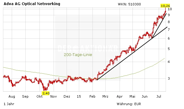 Der TecDAX-Titel ADVA Optical ist mit einer Performance von 218 Prozent der Highflyer seit Jahresbeginn im HDAX. Fast schon abgeschlagen folgen auf den Plätzen 2 und 3 SMA Solar mit 102 Prozent und Apple-Zulieferer Dialog Semiconductor mit 80 Prozent. Doch wie könnte es mit dem Papier weitergehen?