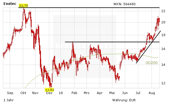 Was für eine starke Entwicklung zuletzt. Nachdem die Aktie des Biotechunternehmens Evotec monatelang seitwärts gelaufen ist, ist nun der Knoten wieder geplatzt. Seit dem Sprung über die 200-Tage-Linie sowie die Hürde bei 17 Euro ist die Aktie von Evotec nahezu nicht mehr zu bremsen. Im Monatsvergleich führt das Papier trotz des leichten Rücksetzers jetzt zum Wochenschluss die Gewinnerliste im TecDAX klar an. Mehr als 27 Prozent ging es nach oben. Auf Platz zwei und drei rangieren mit einem Kursplus in Höhe von 17,5 Prozent und von 14,6 Prozent klar abgeschlagen Bechtle und Wirecard. Auch wenn sicher immer Rücksetzer einkalkuliert werden müssen, langfristig dürfte die Richtung der Evotec-Aktie vorgegeben sein: nach oben. Die nächste wichtige Hürde wartet in Form des 2017er-Hochs bei 22,70 Euro.