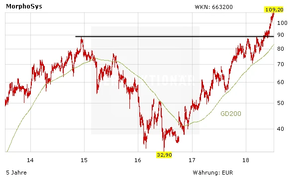 Die Aktie von Morphosys präsentiert sich seit ihrem Ausbruch über die Marke von 90 Euro enorm stark. Der Wert klettert von einem Hoch zum nächsten. Im Monatsvergleich gibt es im TecDAX keine bessere Aktie als Morphosys. 20 Prozent konnte der Wert im Monatsvergleich zulegen. Im Fokus dürfte bei Morphosys aber weiterhin das am weitesten fortgeschrittene eigene Projekt MOR208 stehen. Auch hier dürfte es im laufenden Jahr noch Neuigkeiten geben. Auch wenn nach dem jüngsten steilen Anstieg die Gefahr für einen Rücksetzer gestiegen ist, kann Morphosys weiterhin mit derart starken News wie zuletzt überzeugen, dürfte die Aktie langfristig deutlich höher stehen. Anleger lassen deswegen ihre Gewinne weiter laufen.