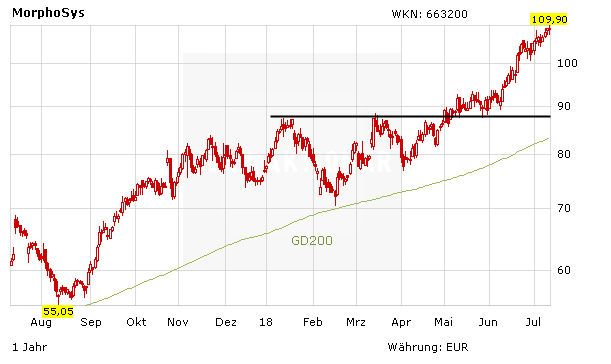 Das Top-Duo der deutschen Biotechszene überzeugt auch performancetechnisch. Morphosys ist im TecDAX-Monatsvergleich mit einem Plus von 16,1 Prozent auf Platz 1. Und auch im Jahresvergleich ist die Gesellschaft ganz vorne dabei. Mit 79,0 Prozent rangiert Morphosys hinter dem Überflieger Wirecard mit plus 130,3 Prozent und ISRA Vision mit plus 81,1 Prozent auf Platz 3 der besten Werte im Index. In den vergangenen Wochen und Monaten konnte Morphosys eine gute News nach der anderen liefern. In der laufenden Woche hat das Unternehmen beispielsweise bekannt gegeben, dass der Lizenzpartner Janssen ein zulassungsrelevantes klinisches Phase-2/3-Studienprogramm (GALAXI) mit Tremfya (Guselkumab) in der Indikation Morbus Crohn gestartet hat. Morbus Crohn ist eine entzündliche Darmerkrankung, die jeden Teil des Magen-Darm-Traktes betreffen kann. Dabei soll die Wirksamkeit und Sichereit von Tremfya bei der Behandlung von Patienten mit moderater bis schwerer Form der Erkrankung untersucht werden. Neben der klinischen Entwicklung bei Morbus Crohn wird Tremfya derzeit außerdem in zwei Phase-3-Studien bei psoriatischer Arthritis untersucht.