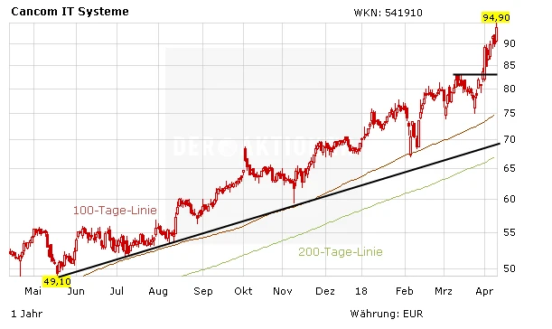 Auf dem aktuellen Niveau bieten sich angesichts der Rallye der letzten Tage Gewinnmitnahmen an. Ein erneuter Einstieg bietet sich im Bereich der 100-Tage-Linie an, an der die Cancom-Aktie seit langem wieder impusliv nach oben drehen konnte. Langfristig sind dreistellige Notierungen durchaus realistisch.