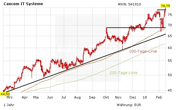 Die scharfe Korrektur an den Märkten ging auch an der Aktie des IT-Dienstleisters Cancom nicht spurlos vorüber. Doch der TecDAX-Titel konnte sich dank bärenstarker Zahlen für das abgelaufene Geschäftsjahr 2017 rasch erholen und wieder den Weg nach oben einschlagen. Im heutigen Handel klettern die Papiere sogar auf ein neues Rekordhoch. Was ist noch drin?