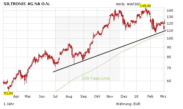 Die Papiere des Wafer-Herstellers sind in den letzen Wochen deutlich unter die Räder gekommen. Während die Aktie Ende Januar noch ein 52-Wochen-Hoch bei 145,40 Euro markierte, rutschte die Aktie in den letzten Wochen auf unter 120 Euro ab. Grund war nicht zuletzt die schlechte Gesamtmarktlage, nachdem die Börsen weltweit deutlich an Punkten verloren.