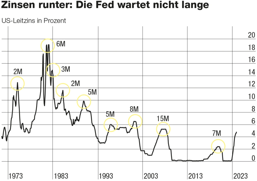 Damit wird nicht nur ein Ende der Zinsanhebungen wahrscheinlicher, sondern sogar eine Zinswende. Wie aus dem CME FedWatch Tool hervorgeht, rechnen 67,9 Prozent der Marktteilnehmer zum 20. September 2023 mit einem Niveau von 4,50 bis 4,75 Prozent oder niedriger. Die Historie stützt diese Erwartungshaltung: In den vergangenen 50 Jahren lagen zwischen der letzten Zinserhöhung und der ersten -kürzung meist nur wenige Monate (siehe Grafik unten).