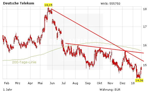 Auf Basis des aktuellen Kursniveaus würde einer erhöhte Ausschüttung auf 0,66 Euro je Aktie einer Dividendenrendite von gut vier Prozent entsprechen. Gleichzeitig ist das Abwärtsrisiko mittlerweile klein. Die Aktien der Deutschen Telekom legten daraufhin zu - zeitweise um mehr als drei Prozent auf 14,87 Euro. Damit rangieren sie wieder über der von charttechnisch orientierten Anlegern viel beachteten 21-Tage-Linie. Sie gilt als Indikator für den kurzfristigen Trend und verläuft bei 14,75 Euro. Sie ist zwar noch abwärts gerichtet, allerdings mittlerweile weniger steil.