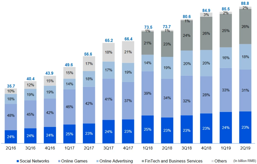 Tencent hat die Umsatzerwartungen der Analysten im zweiten Quartal nicht übertreffen können. Das lag vor allem an der schwachen Performance im Segment „Online Advertising“. Der chinesische Internet-Gigant konnte hier nur einen Zuwachs von 16 Prozent auf 16,4 Milliarden Yuan erzielen. Im Q2 2018 belief sich die Wachstumsrate noch auf 39 Prozent. Online-Advertising macht aktuell 18 Prozent der Tencent-Umsätze aus.