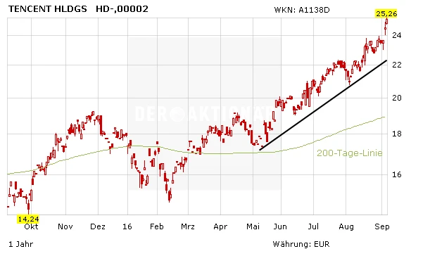 Mit dem Sprung auf 25,26 Euro konnte die Aktie im heutigen xetra-Handel ein neues Allzeithoch markieren. Angesichts der perfekten Wachstumsbedingungen bleibt die Tencent-Aktie eine der Favoriten im Bereich E-Commerce. Trotz des hohen KGV von 40 für 2017 sollten mutige Anleger einen Kursrücksetzer zum Aufbau einer ersten Position nutzen – bereits Investierte lassen die Gewinne laufen.