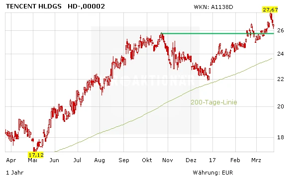 Das umfassende Ökosystem, in dem der Nutzer derart viele Möglichkeiten hat seinen Alltag digital zu gestalten, ist Tencents real gewordener Traum eines jeden Internetunternehmens und macht die Tencent-Aktie – neben Alibaba – zum chinesischen Top-Pick. Die knapp verpassten Zahlen geben jetzt gute Einstieg- oder Zukaufchancen ab. Die Unterstützung bei 25,80 sichert ab und der mittelfristige Aufwärtstrend ist intakt. Der langfristige Aufwärtstrend hält seit 2013 an. Da braucht es wesentlich mehr als knapp verpasste Erwartungen, um diesen Trend zu brechen.
