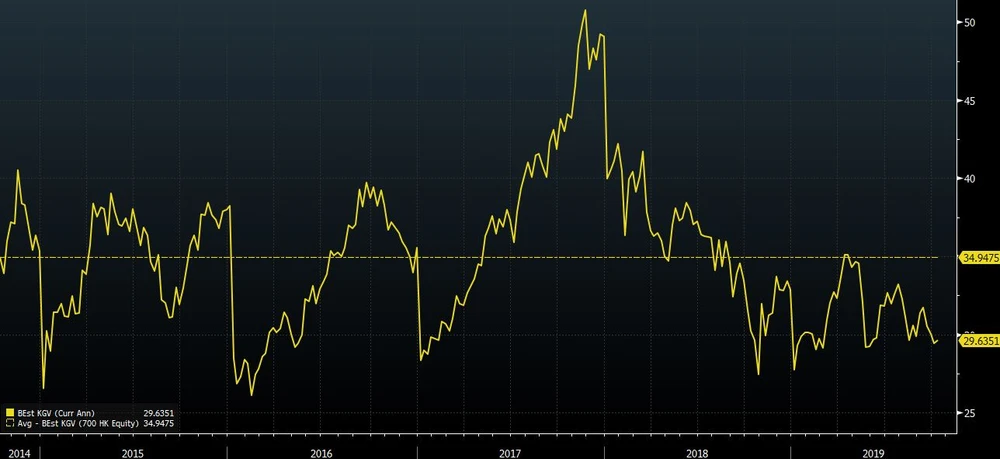 Tencent verfügt über einen „stabilen Ausblick“, der mit einem KGV von aktuell 30 sogar im historischen Vergleich günstig bewertet ist. Attraktiv, da 2019 im Vergleich zum vorangegangenen Geschäftsjahr Gewinnmargen und Wachstumsraten sogar leicht anziehen dürften – und nichts liebt die Börse mehr als steigendes Gewinnwachstum.