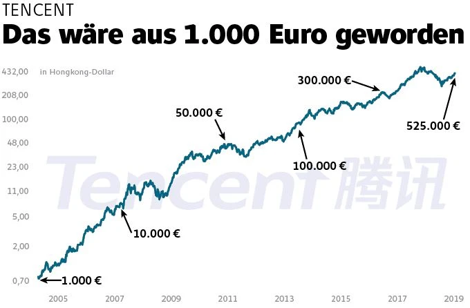 Mit anderen Worten: Anleger, die am ersten Handelstag für 1.000 Euro Tencent-Aktien kauften, sitzen heute auf einem Paket im Wert von 525.000 Euro.
