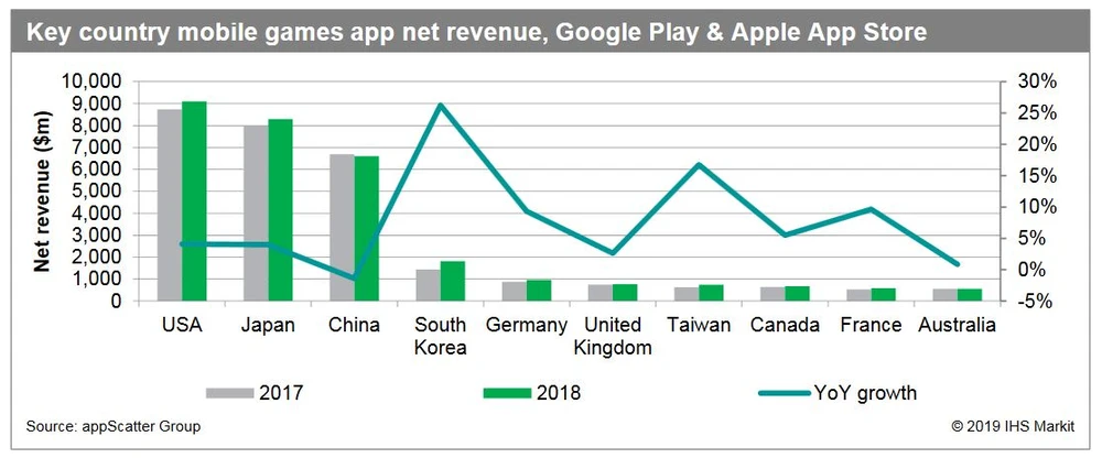 Laut aktuellen Zahlen von IHS Markit wuchsen die internationalen Umsätze beider Unternehmen mit Mobile-Games von 78 Millionen Dollar 2017 auf 472 Millionen Dollar 2018. Ein Wachstum von 505 Prozent.