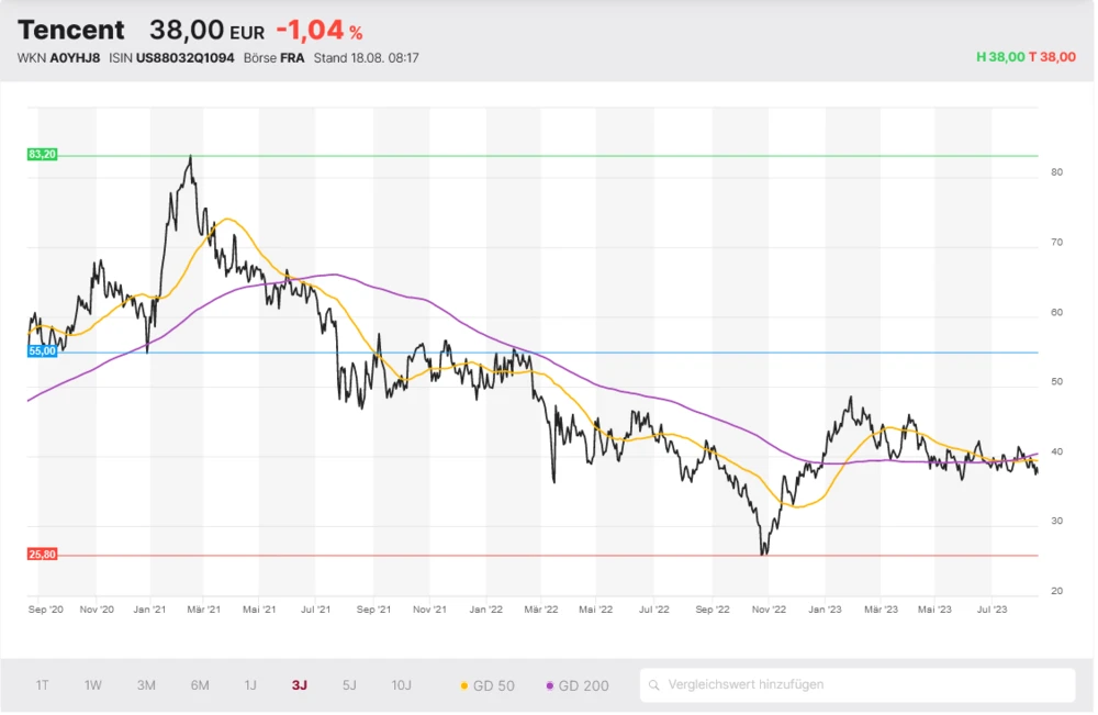 Tencent hat von den Tiefstkursen Ende Oktober des letzten Jahres mehr als 40 Prozent zugelegt und hängt derzeit an der 200-Tage-Linie fest. Mit Überschreiten dieser wichtigen Chartmarke würde ein Kaufsignal ausgelöst werden. Aus aktueller Sicht bleiben Anleger weiterhin an der Seitenlinie.