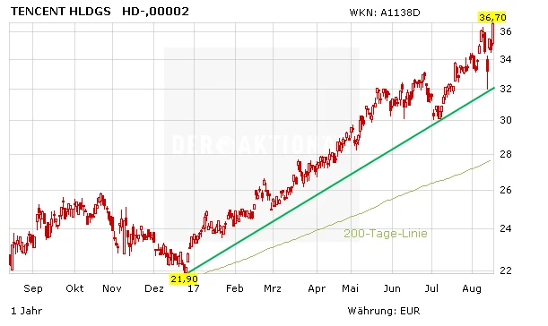Die Zahlen überzeugen, obwohl die Analysten bereits im Vorfeld hohe Erwartungen an den Internet-Konzern hatten. Das starke Quartal belohnte der Markt mit einem Kursanstieg von drei Prozent. Im Laufe des Tages dürfte bei der Tencent-Aktie jedoch noch Potential lauern. Aktuell heißt es für den Top-Pick aus China erst einmal: Allzeithoch auf 36,65 Euro. Anleger lassen die Gewinne laufen.