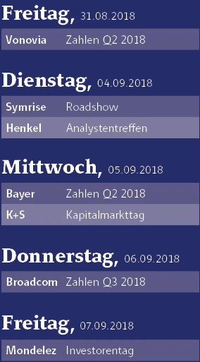 In der neuen Woche gibt es zudem noch die Entscheidung, wer Ende September den DAX verlassen muss und wer aufsteigt. Der Arbeitskreis Aktienindizes der Deutschen Börse gibt am Mittwochabend seine Entscheidung bekannt. Maßgeblich für die Zugehörigkeit zur Top-Gruppe der 30 Konzerne im Deutschen Aktienindex sind Börsenumsatz (Handelsvolumen) und Börsenwert (Marktkapitalisierung) der Unternehmen. DAX-Gründungsmitglied Commerzbank wird wohl dem Finanzdienstleister Wirecard weichen müssen, der in den vergangenen Monaten nicht nur die CoBank weit hinter sich gelassen hat, sondern auch die Deutsche Bank.