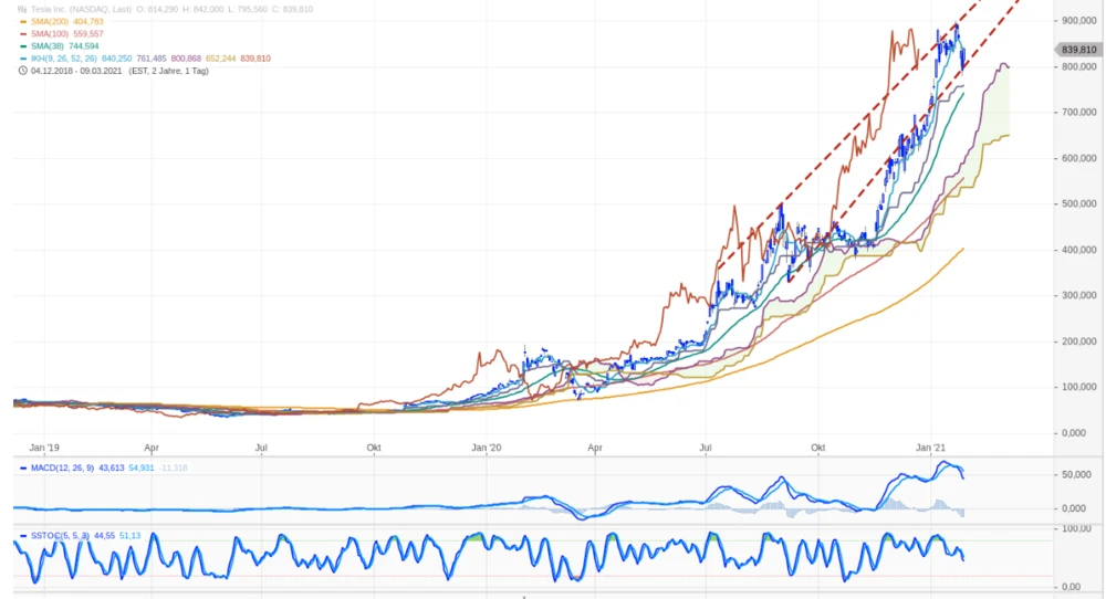 „Die Tesla-Aktie zeigt sich weiter eingebettet in einen klassischen charttechnischen Aufwärtstrend. Aktuell rangiert die Aktie bei rund 840 Dollar. Zum Ende vergangener Woche zeigte die Tesla-Aktie abermals eine auffällige Tagesschwankung. Dazu kommt ein Downside-Gap vom 28. Januar. Es lässt sich weiterhin nicht wegdiskutieren, dass der Trendfolgeindikator MACD deutlich überkauft ist. Die kurzfristige Slow-Stochastik zeigt sich allerdings nach den letzten Verkäufen wieder neutral. Der „Alles-auf-einen-Blick“-Indikator Ichimoku steht mittel- bis langfristig für anhaltende Trendstabilität. Ein wichtiges Signal dafür war auch das Halten der unteren Aufwärtstrendlinie am 29.Januar bei rund 803 Dollar“, sagt Charttechnik-Experte Martin Utschneider von Donner & Reuschel.