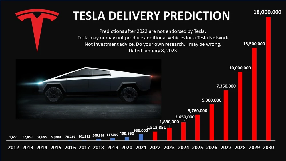 Reichen solche Rabatte, um Verfolger wie BYD, BMW und Porsche abzuschütteln und weiter rasant zu wachsen? Bullen wie „Big Tesla“ twittern Anfang Januar erneut Prognosen einer Verzehnfachung des Absatzes bis 2030. Ark Invest glaubt weiterhin, dass schon 2026 der Absatz mindestens auf zehn Millionen Elektroautos steigt.