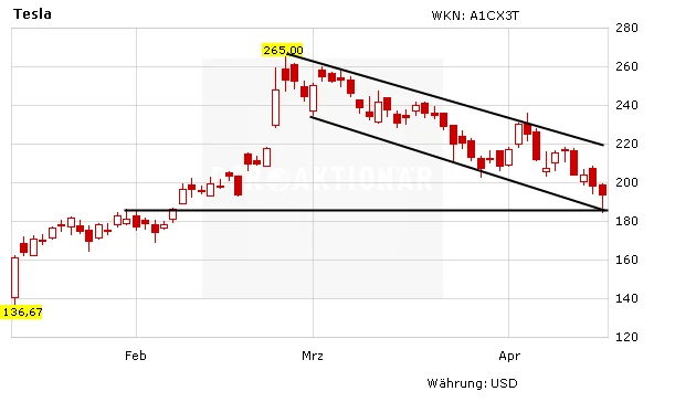 Nach einer fulminanten Rallye korrigiert der Titel seit Anfang März in Form eines Trendkanals. Mittlerweile steht die Aktie bereits rund 30 Prozent unter ihrem Allzeithoch. Im gestrigen Handel wurde eine wichtige horizontale Unterstützungslinie bei rund 195 Dollar erreicht. Die Chancen stehen gut, dass die Tesla-Aktie hier nach oben abprallt. Ziele auf der Oberseite sind zunächst 218 Dollar und später 235 Dollar. Hält die allgemeine Marktschwäche jedoch an, so ist eine Ausweitung der Korrektur möglich. In diesem Fall liegt das nächste Ziel bei 170 Dollar.