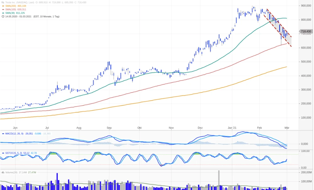„Nach dem Verlassen des bis Anfang Februar intakten Aufwärtstrends haben sich die Papiere von Tesla auf bis zu 619 Dollar verbilligt. Hier könnte nun allerdings auch eine strategische Bodenbildung (23. Februar) stattgefunden haben. Diese 619 Dollar waren am 23.02. auch gleichbedeutend mit der 100-Tage-Linie. Trotzdem befinden sich die Tesla-Aktien auch heute noch im nach wie vor intakten Abwärtsmodus (siehe Chartbild). Diesen nachhaltig zu verlassen bedarf es Notierungen oberhalb von 725 Dollar. Ein ausverkaufter MACD und eine neutrale Slow-Stochastik senden noch keine derartigen Signale. Auch der Ichimoku-Indikator zeigt sich neutral“, sagt Charttechnik-Experte Martin Utschneider von Donner & Reuschel.