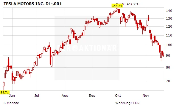 DER AKTIONÄR bleibt bei seiner Meinung: Mit der Elektro-Limousine Model S ist Tesla ein großer Wurf gelungen. Allerdings ist die Bewertung der Aktie mit einem 2014er KGV von 76 extrem hoch – zudem hat Tesla auch mit einigen Problemen zu kämpfen. Mehr dazu lesen Sie in der aktuellen Ausgabe 48 des AKTIONÄR. Anleger, die der Short-Empfehlung gefolgt sind, bleiben dabei und beachten den Stoppkurs von 110 Euro umgerechnet 148 Dollar).