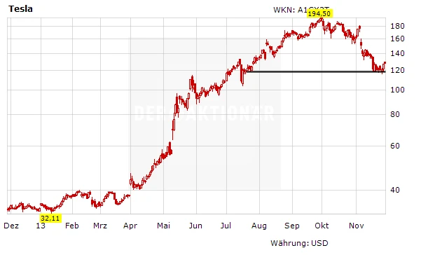 Dennoch: Aus fundamentaler Sicht erscheint die Tesla-Aktie zu hoch bewertet. Anleger, die der Short-Empfehlung gefolgt sind, bleiben dabei, beachten aber unbedingt den Stoppkurs von 110 Euro (umgerechnet 148 Dollar).