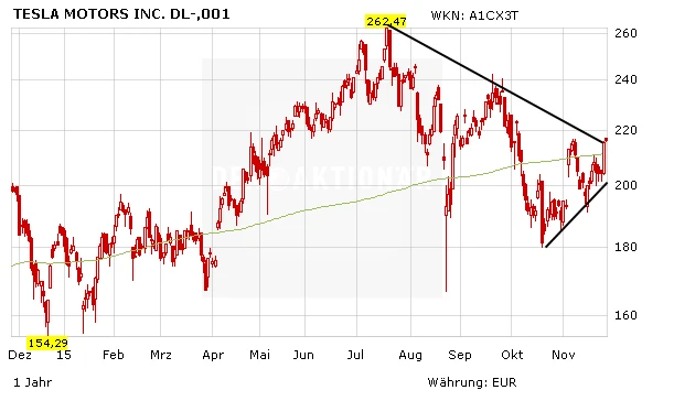 Der Analyst bestätigte sein Kursziel bei 325 Dollar und rechnet somit in den nächsten zwölf Monaten mit einem Kursanstieg von über 40 Prozent. Die Einstufung beließ er auf „Outperform“. Im nächsten Jahr dürfte der Gewinn pro Aktie aufgrund höherer Model-S-Margen und niedriger Forschungs- und Entwicklungskosten auf vier Dollar zulegen. In diesem Jahr rechnen die Analysten laut Bloomberg mit einem Verlust von 1,19 Dollar je Aktie.