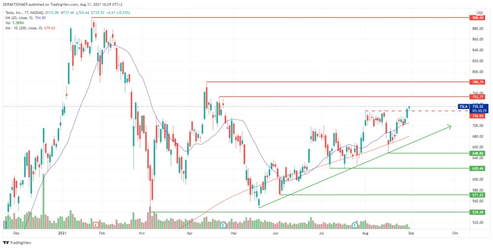 Die Tesla-Aktie erholt sich weiter und hat am gestrigen Montag ein frisches technisches Kaufsignal ausgelöst. Durch den Ausbruch ist es wahrscheinlich, dass weitere Käufer angezogen werden und so das Momentum weiterhin positiv bleibt. Als nächstes Etappenziel steht zunächst die Marke von 780 Dollar im Fokus.