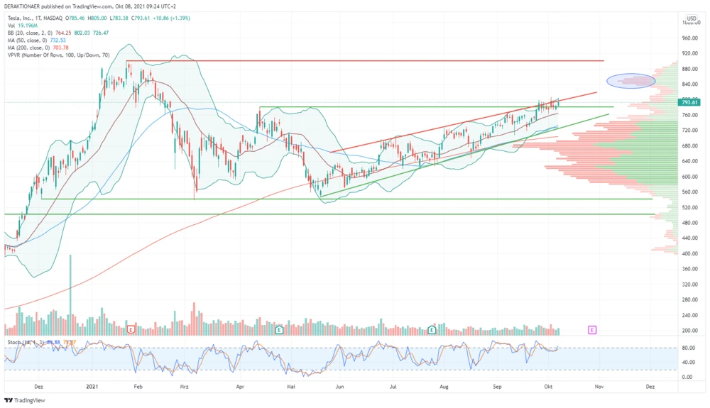 Die Tesla-Aktie hat einen schwachen Wochenauftakt hingelegt, konnte sich aber wieder berappeln. Auf kurze Sicht muss dennoch mit einer Verschnaufpause gerechnet werden. Rücksetzer wären nach der letzten Rallye aber kein Beinbruch. Der Aufwärtstrend ist nach wie vor intakt.