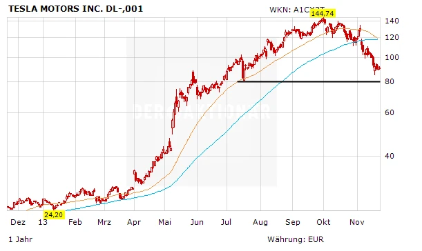 DER AKTIONÄR sieht sich in seiner Meinung bestätigt: Mit der Elektro-Limousine Model S ist Tesla ein großer Wurf gelungen, die Bewertung der Aktie ist mit einem 2014er KGV von 76 allerdings extrem hoch – und auch anderweitig hat Tesla mit einigen Herausforderungen zu kämpfen. Anleger, die der Short-Empfehlung gefolgt sind, bleiben dabei und beachten den Stoppkurs von 110 Euro (umgerechnet 148 Dollar).