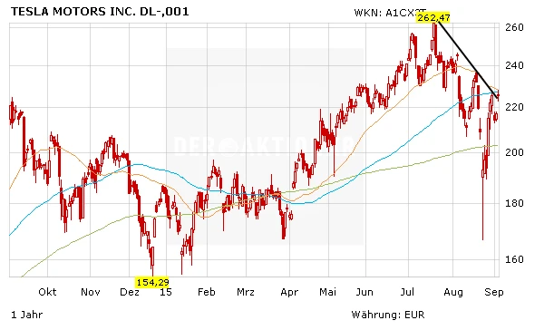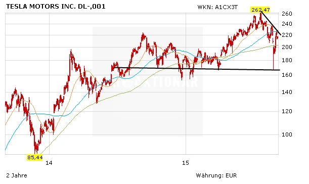 Durch den starken Kursrücksetzer in der vergangenen Handelswoche wurde die 200-Tage-Linie unterschritten. Mit einem starken Rebound holte Tesla allerdings das verlorene Terrain schnell wieder auf. In der Aktie steckt großes nach wie vor großes Potenzial, aber nicht ohne Risiko. An der Börse gab es bereits sehr viele Vorschußlorbeeren für Tesla. Mit einer Bewertung von 28 Milliarden Euro ist der Titel ambitioniert bewertet. Überwindet die Aktie den kurzfristigen Abwärtstrend bei knapp 250 Dollar (rund 223 Euro) nachhaltig, können risikoberits Anleger eine kleine Position wagen.