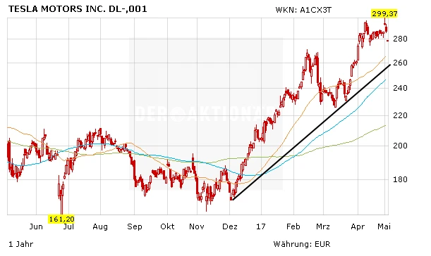Die Aktie von Tesla ist in den letzten sechs Monaten um mehr als 50 Prozent geklettert. Elon Musk hat seinen Elektroautobauer auf eine Marktkapitalisierung von 52 Milliarden Dollar gepeitscht und damit GM und Ford überholt. Und das mit einer Jahresproduktion 2016 von 76.230 Autos!