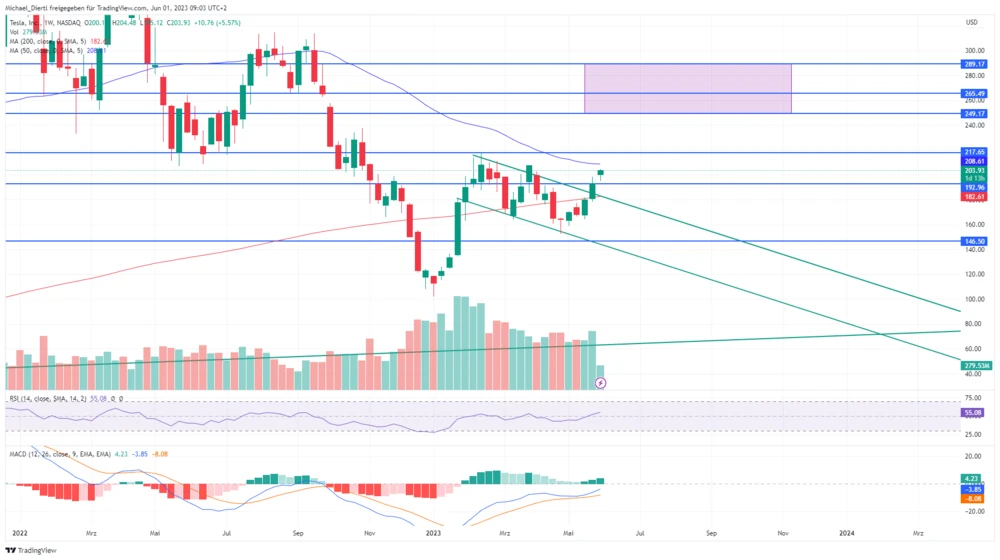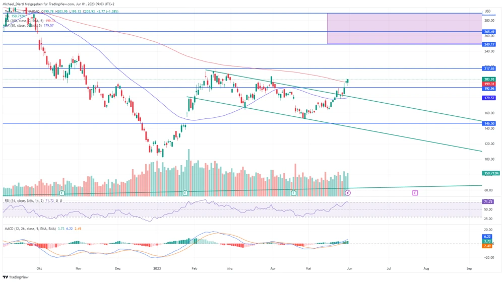 Dieses wurde am Dienstag bestätigt, als Tesla mit einem Gap nach oben öffnete und dabei nicht nur den GD50 bei 199,31 Dollar, sondern auch die psychologisch wichtige 200-Dollar-Marke überwand. Auch am Mittwoch erzeugte der Chart ein weiteres Kaufsignal, indem er den GD50 im Laufe des Tages erneut antestete, diesen aber schließlich mit einem Kursplus von 1,38 Prozent und einer sogenannten Hammer-Kerze beendete.