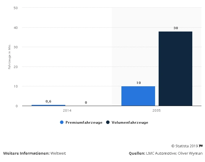 Prognose zur globalen Produktion von voll- und teilautomatisierten Fahrzeugen in den Jahren 2014 und 2035 (in Millionen Stück):