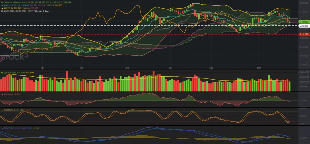 Aus technischer Sicht spielt Tesla weiterhin ihre chart- und markttechnischen Marken aus. "Wie erwartet erfolgte die Rückkehr in die Ichimoku-Wolke („Kumo“). Aus dieser droht der Chart nun sogar nach unten auszubrechen. Dies wäre bei einem Bruch des Doppeltiefs bei 235,35 US-Dollar gegeben. Bricht dann auch dieser Support, könnte die Tesla-Aktie recht schnell wieder bei ihrem Ausgangs-Punkt (18.08.2023) notieren. Dieser verläuft bei 211,23 US-Dollar. Die ganze Performance seit 18.08.2023 wäre dann wieder dahin. Das Momentum (14 Tage) schwächte sich zuletzt ab und notiert nun negativ. Die Slow-Stochastik wartet mit einem kurzfristigen Kaufsignal auf. Dies macht Hoffnung, dass die 235,35 US-Dollar doch halten könnten. Der trendfolgende MACD-Indikator zeigt sich neutral. Es steht und fällt somit an den 235,35 US-Dollar und der unteren Signallinie der „Kumo“", sagt Charttechnik-Experte Martin Utschneider.