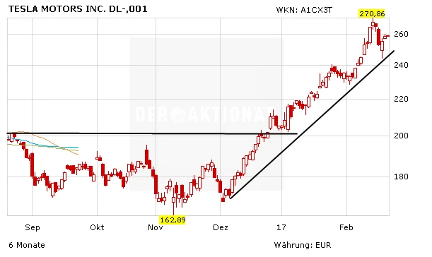 Mittwoch nach Börsenschluss in den USA wird Elektroautopionier Tesla aber erst einmal Zahlen für das vierte Quartal liefern. Die Analysten erwarten erneut rote Zahlen. Wobei sich die für das vierte Quartal abgegebenen Prognosen sich in einer extrem breiten Range bewegen. Im Durchschnitt wird ein Verlust pro Aktie von 0,99 Dollar bei einem Umsatz von rund 2,1 Milliarden Dollar erwartet.