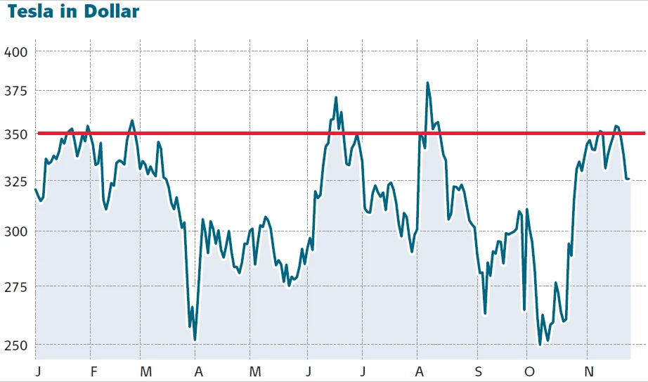 Die Tesla-Aktie zeigte zuletzt deutliche Stärke gegenüber anderen Tech-Werten aus den USA. Heute geht es rund 2,4 Prozent auf 337,67 Dollar nach unten. Die große Seitwärtsspanne der vergangenen Monate zwischen 244 und 387 Dollar ist nach wie vor intakt. DER AKTIONÄR meint: Besser an der Seitenlinie abwarten.