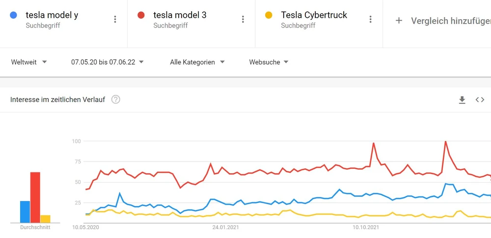Doch kumuliert ist das Model 3 unerreicht und liegt auch im öffentlichen Interesse – siehe Google Trends – in den USA und weltweit klar vor dem Model Y und Cybertruck.