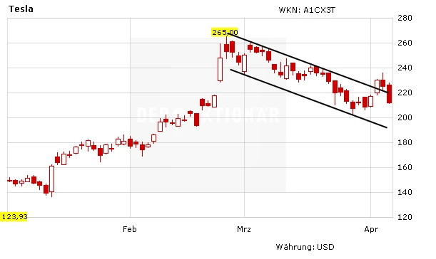 Die Tesla Aktie brach am 2. April aus dem Abwärtstrendkanal nach oben aus. Im Rahmen der allgemeinen Marktschwäche vom letzten Freitag fiel die Aktie jedoch umgehend in den Trendkanal zurück. Der Abwärtstrendkanal ist damit weiter intakt und eine Ausweitung der Korrektur bis zur horizontalen Widerstandslinie bei 195 Dollar ist wahrscheinlich.