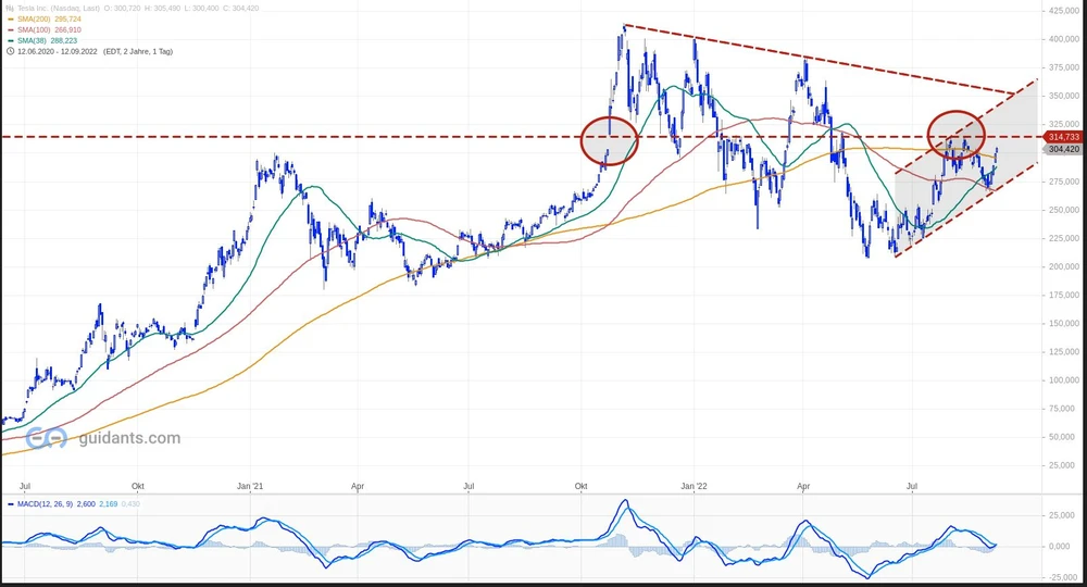 „Nachdem Tesla mal wieder seinen markt- und charttechnischen Signalen gerecht wurde, kristallisiert sich aktuell schon wieder das nächste hochinteressante (!) charttechnische Muster heraus. Auch diesmal scheint das Chartbild wieder förmlich mit uns zu „sprechen“. In einer seit Mitte Juni intakten übergeordneten Aufwärtstendenz scheint der Chart nun demnächst an eine immens wichtige charttechnische Marke anklopfen zu wollen. Diese verläuft punktgenau bei 314,73 US-Dollar. Warum ist dieses Niveau nun so immens wichtig? Zum einen resultiert es aus dem Opening-Gap vom 25.10.2021 und danach als bestätigende Supportlinie. Zum anderen waren genau diese 314,73 US-Dollar zuletzt ein nicht zu knackender Doppel-Widerstand. Nachdem aber nun am vergangenen Freitag die 200-Tage-Linie wieder zurückerobert wurde, sind die 314,73 die nächste gewichtige Hürde. Der Trendfolge-Indikator MACD generiert zur Stunde ein Kaufsignal. Damit wird zumindest die aktuelle übergeordnete Aufwärtsbewegung bestätigt. Allerdings nähert sich parallel dazu die Slow-Stochastik dem überkauften Bereich. Dies könnte dazu führen, dass sich der Tesla-Chart an der 314,73 zunächst etwas schwer tun könnte. Zudem verheißt die Fibonacci-Projektion bei 311,73 US-Dollar ebenfalls „Gegenwind“. Der Fokus gilt daher in den nächsten Tagen primär der Drei-Dollar-Bandbreite zwischen 314,73 und 311,73 US-Dollar. Sollte dort ein massiver Abprall erfolgen, dann käme der 38-Tage-Linie bei 288,22 US-Dollar wieder Bedeutung zu", sagt Charttechnik-Spezialist Martin Utschneider von Donner & Reuschel.